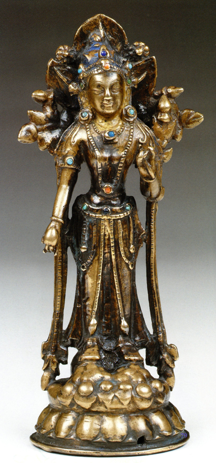 Jñanapâramitâ, la connaissance, onzième des douze pâramitâ, personnifications des perfections ou vertus que le bodhisattva acquiert en gravissant les degrés de sa carrière. Cette très belle sculpture devait initialement faire partie d'une série de douze.